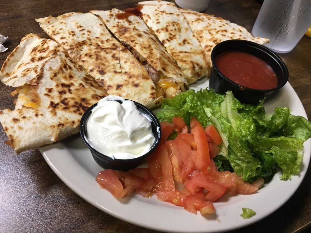 2 toasted tortillas covered in jack/cheddar cheese, diced tomatoes and jalapeos, lettuce, and Mexi-ranch dressing.