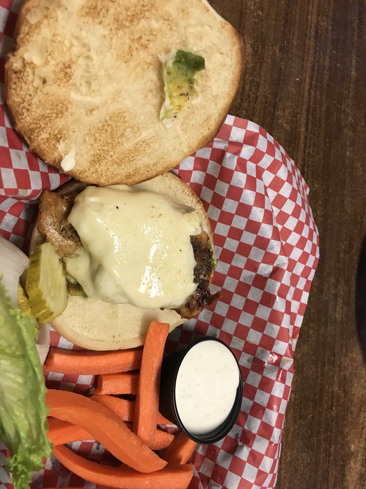 Blackened patty covered with bleu cheese crumbles, bleu cheese dressing, and 5 cheese blend.